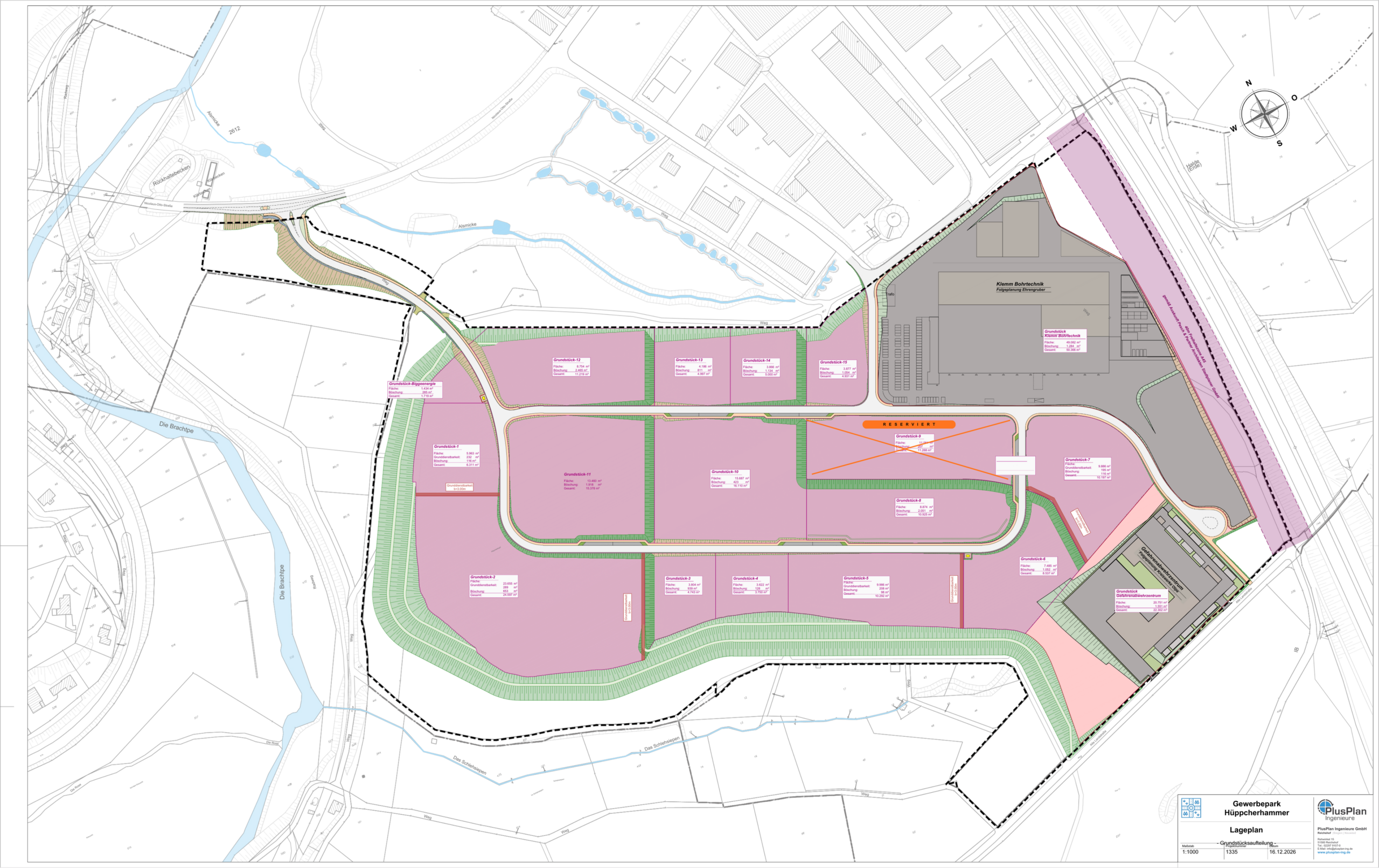 Die Erschließung der Bauabschnitte II und III des Gewerbeparks Hüppcherhammer ist in vollem Gange. Die Geländeprofilierung sowie die Straßen- und Kanalbauarbeiten werden von einem Generalunternehmer ausgeführt und sollen bis Ende 2026 fertiggestellt sein. Die aktuell noch verfügbaren rd. 150.000 m² Gewerbefläche können also ab Ende 2026 bebaut werden.